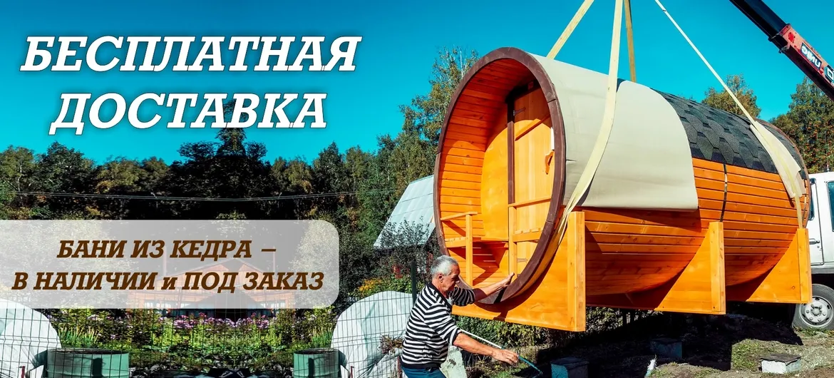 Закажите любую баню-бочку или каркасно-щитовую баню из кедра прямо сейчас, внеся всего 50% от стоимости, - получите доставку готового изделия со скидкой до 100%!