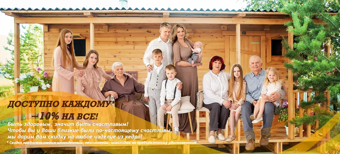 Чтобы здоровье всегда было богатырским, а ваши дети и родители радовали ежедневно счастливыми улыбками, дарим Вам скидку 10% на любое изделие из кедра*!