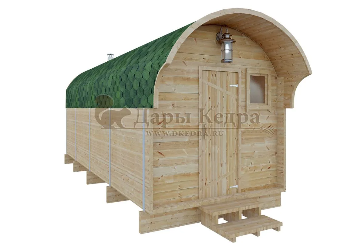 Баня-буханка более просторная за счет увеличенной высоты потолков и ровного пола. Козырек не только украшает баню, но и защищает оставленную обувь от дождя. Лавочки из кедра находятся по всей длине бани-бочки с обеих сторон. Печь расположена в парилке около дальней стены. Время растопки такой бани не превышает 30 минут. В зависимости от выбранного размера баня-бочка буханка с козырьком имеет следующую комплектацию: