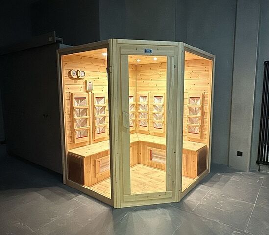 Четырёхместная угловая инфракрасная сауна кабина из кедра с карбоновыми излучателями Это специально оборудованная кедровая кабина для прогрева тела человека сухим теплом. Воздух в таких парных не нагревается. Инфракрасные лучи воздействуют на тело, равномерно прогревая мышцы, суставы и органы. Карбоновые излучатели, встроенные в стены кабины, обладают мягким прогревом, что полностью исключает возможность ожога. Работает кабина за счет электричества. Установка сауны в угол, позволяет рационально использовать пространство помещения. Подходит как для домашнего использования, так и для коммерции. Обращаем Ваше внимание что в стандартную комплектацию входит трапик для ног, но вы можете его заменить на цельный пол совершенно бесплатно! Целебная древесина кедра и инфракрасные лучи благотворно влияют на организм человека в целом. При регулярном использовании инфракрасной сауны укрепляется иммунитет, улучшается кровообращение и состояние кожи, выводятся токсины.