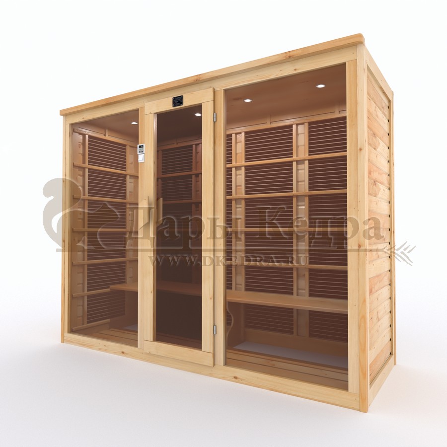 Четырёхместная инфракрасная сауна кабина из кедра с карбоновыми излучателями Это специально оборудованная кедровая кабина для прогрева тела человека сухим теплом. Воздух в таких парных не нагревается. Инфракрасные лучи воздействуют на тело, равномерно прогревая мышцы, суставы и органы. Карбоновые излучатели, встроенные в стены кабины, обладают мягким прогревом, что полностью исключает возможность ожога. Работает кабина за счет электричества. Инфракрасная сауна с карбоновыми излучателями подойдет как для домашнего использования, так и для коммерции. Обращаем Ваше внимание, что в стандартную комплектацию входит трапик для ног, но вы можете его заменить на цельный пол совершенно бесплатно! Целебная древесина кедра и инфракрасные лучи благотворно влияют на организм человека в целом. При регулярном использовании инфракрасной сауны укрепляется иммунитет, улучшается кровообращение и состояние кожи, выводятся токсины.