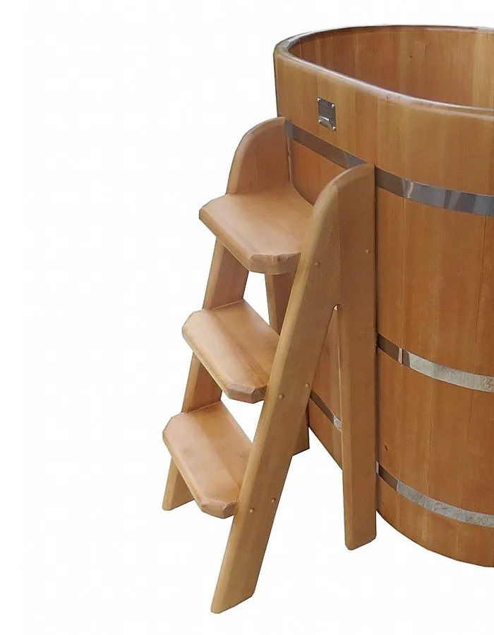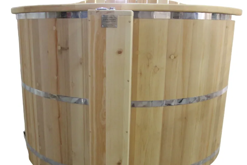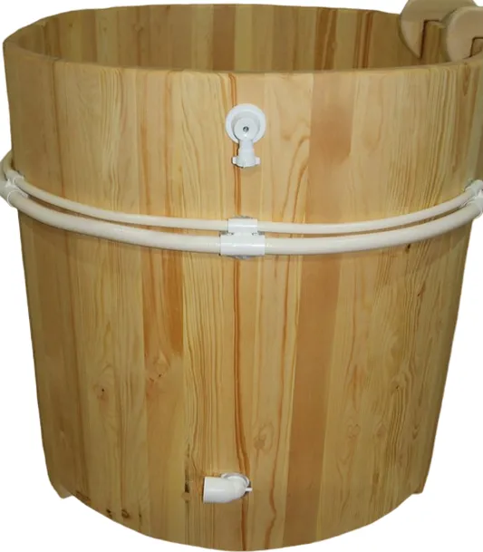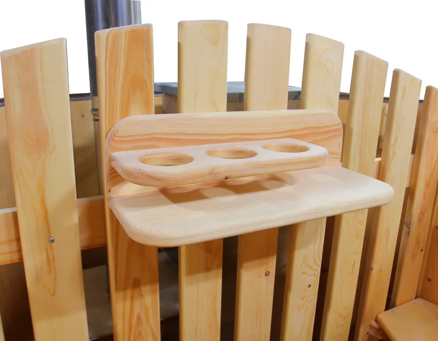 Это уличная подогреваемая купель с круглой внутренней чашей из термопластика. Для удобства пользования купель оборудована лавочками, приставной и внутренней лестницей. Подогрев воды осуществляется за счет внешней печи с дымоходом. Термопластик устойчив к воздействию температур, облегчает уход за фурако и увеличивает срок ее службы.