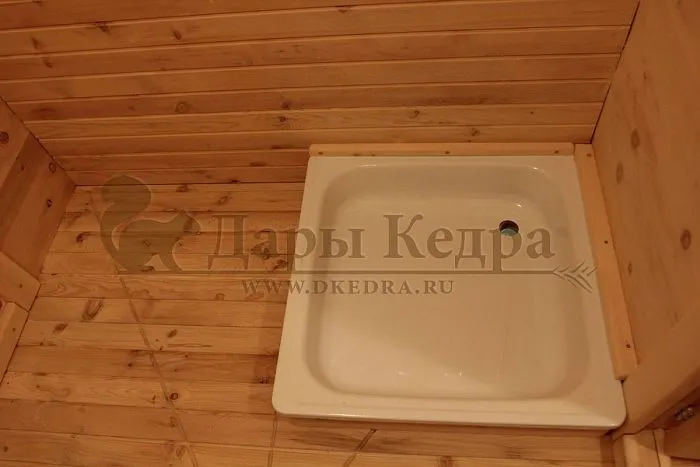 При появлении ровного пола возникает вопрос о качественном сливе воды в моечном отделении, поэтому в этом случае целесообразно установить душевой поддон. В комплекте к поддону идет штанга для шторки. Таким образом, в организованной помывочной зоне будет комфортно принимать водные процедуры, не мешая другим участникам банных процедур.